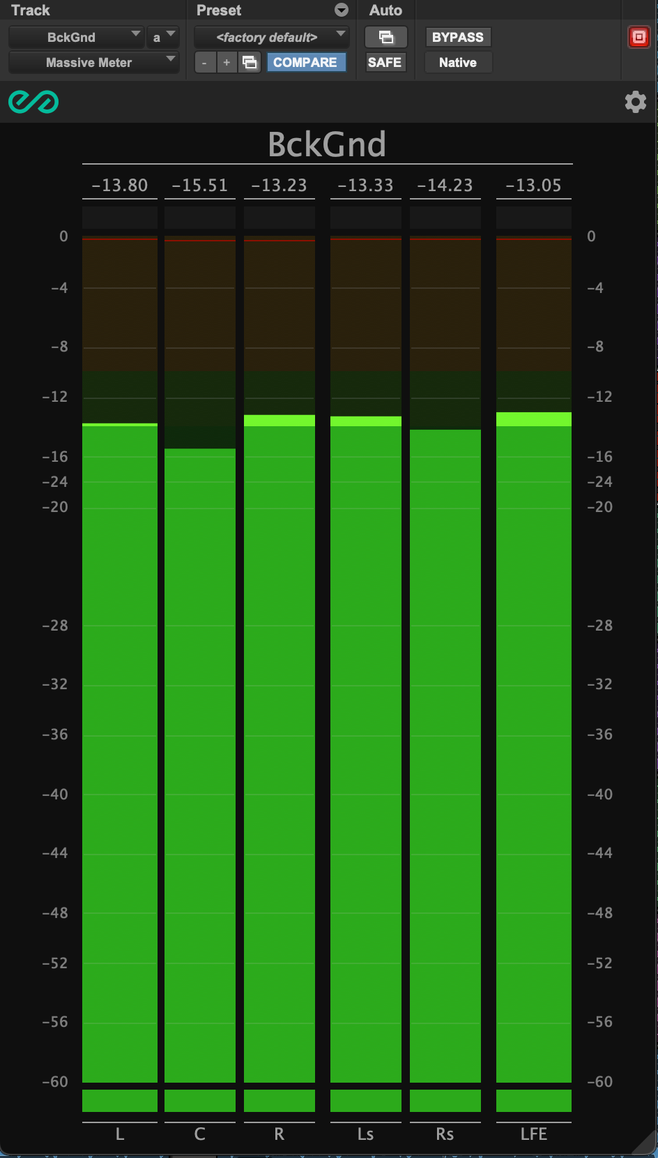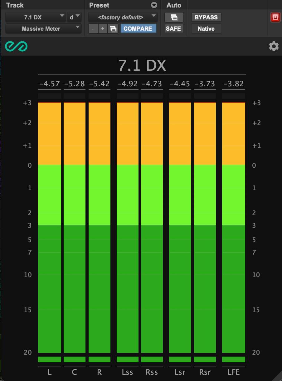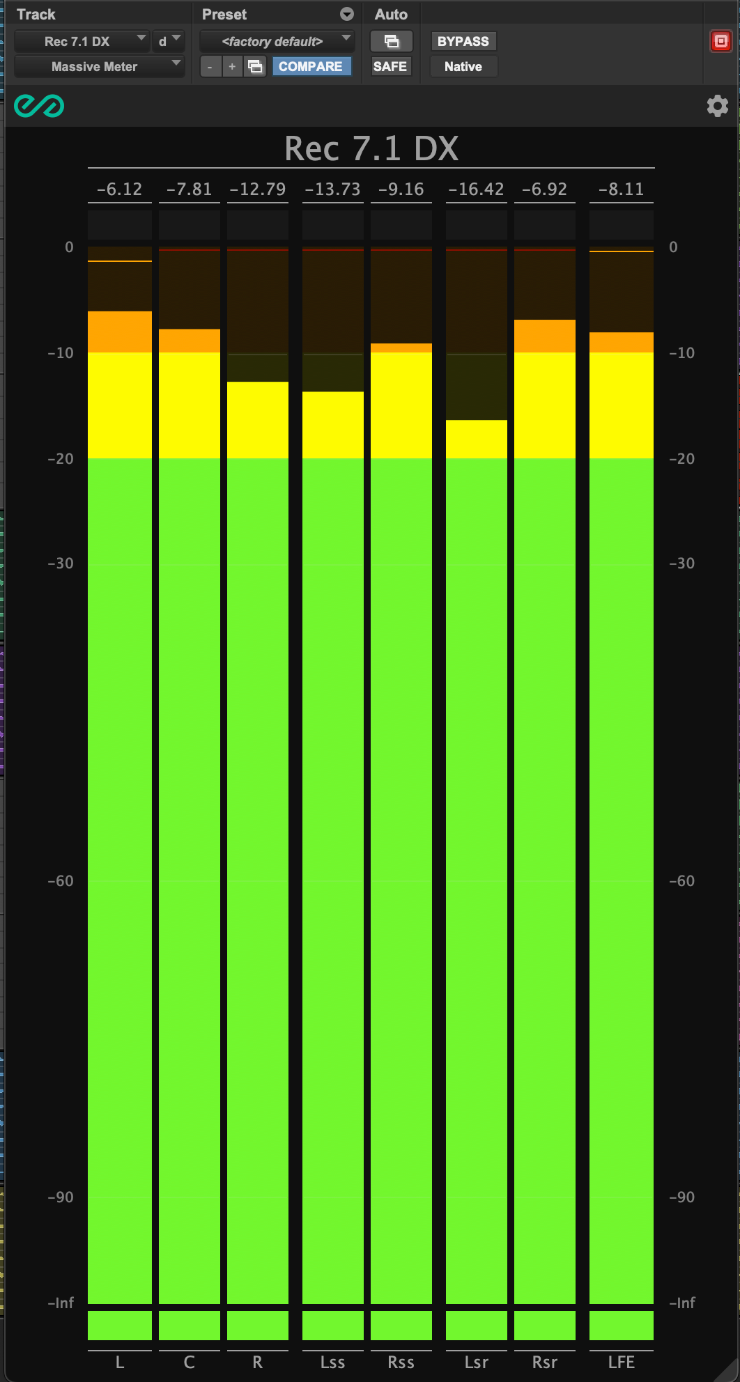 The Massive Meter supports mono, stereo, LCR, LCRS, Quad, 5.0, 5.1, 6.0, 6.1, 7.0, and 7.1 channel widths.